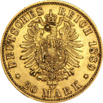 Suite à la victoire de la Prusse sur la France en 1870, les Etats allemands sont unis autour d’une même politique: le second empire allemand (sous le règne d’un nouvel empereur, le roi de Prusse « Kaiser »). Cette même époque (1873) marque l’apparition d’une nouvelle monnaie ; le Reichsmark. C’est la naissance du Mark allemand et du 20 Reichsmarks. Mis en circulation dans tous les membres de l’Empire, il couvrira 54 royaumes, 6 grands duchés, 5 duchés, 7 principautés et 3 villes libres (chacun frappant ses propres Reichsmarks d’or). Les plus utilisés demeurent les 20 Reichsmarks frappés par la Prusse sur lesquels on retrouve le buste de l’empereur Guillaume II en uniforme de cuirassier, avec l’inscription «DEUTSCHER KAISER KONIG VON PREUSSEN » (Empereur allemand, roi de Prusse).