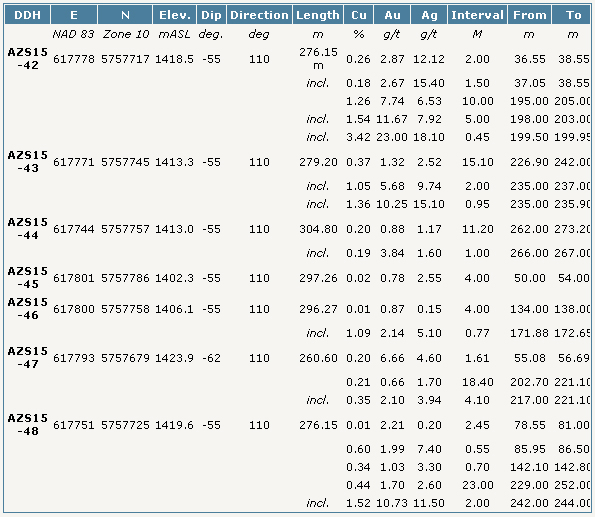 The Program included 7 closely-spaced drill holes totaling 1990 metres targeting the Aurizon-South copper-gold breccia zone. Six of the seven drill holes encountered significant copper-gold-silver mineralization, such as AZS15-42 that intercepted 10 metres grading 7.7 grams per ton (gpt) gold, 1.3% copper, and 6.5 gpt silver, which includes a 5 metre interval grading 11.7 gpt gold, 1.5 % copper, 7.9 gpt silver. Hole AZS15-48 includes a 2 metre intercept grading 10..7 gpt gold. The Aurizon South breccia structure has been shown by previous drilling to have a strike length exceeding 300 m and extends to more than 600 metres below surface. Within this large structure, the recent drilling has expanded the high-grade portion of the structure known to exist at depths above 200 metres, by 75 meters along strike and 50 meters down dip. All significant Aurizon-South assay results are tabulated below.